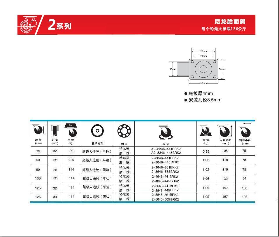 輪    徑: 3寸(75mm)、3.5寸(90mm)、4寸(100mm)、5寸(125mm)、